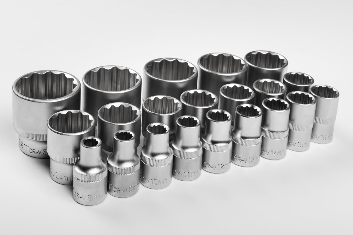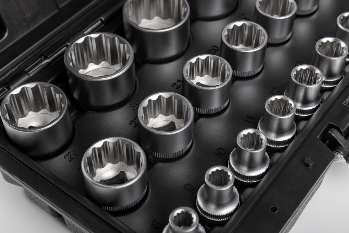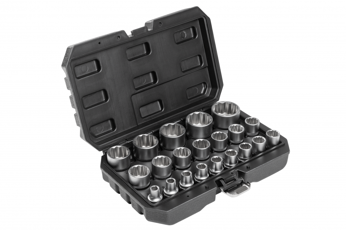 Набор торцевых головок, которые благодаря множеству треугольных зубцов/вставок позволяют работать с болтами и гайками с аналогичной формой головки.