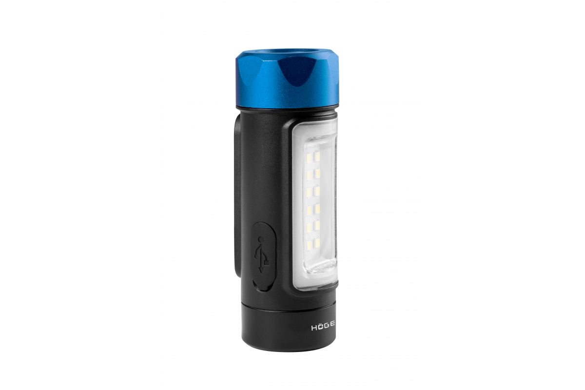 Компактный прожектор со светодиодным фонарем с двумя различными источниками света: боковым и фронтальным.