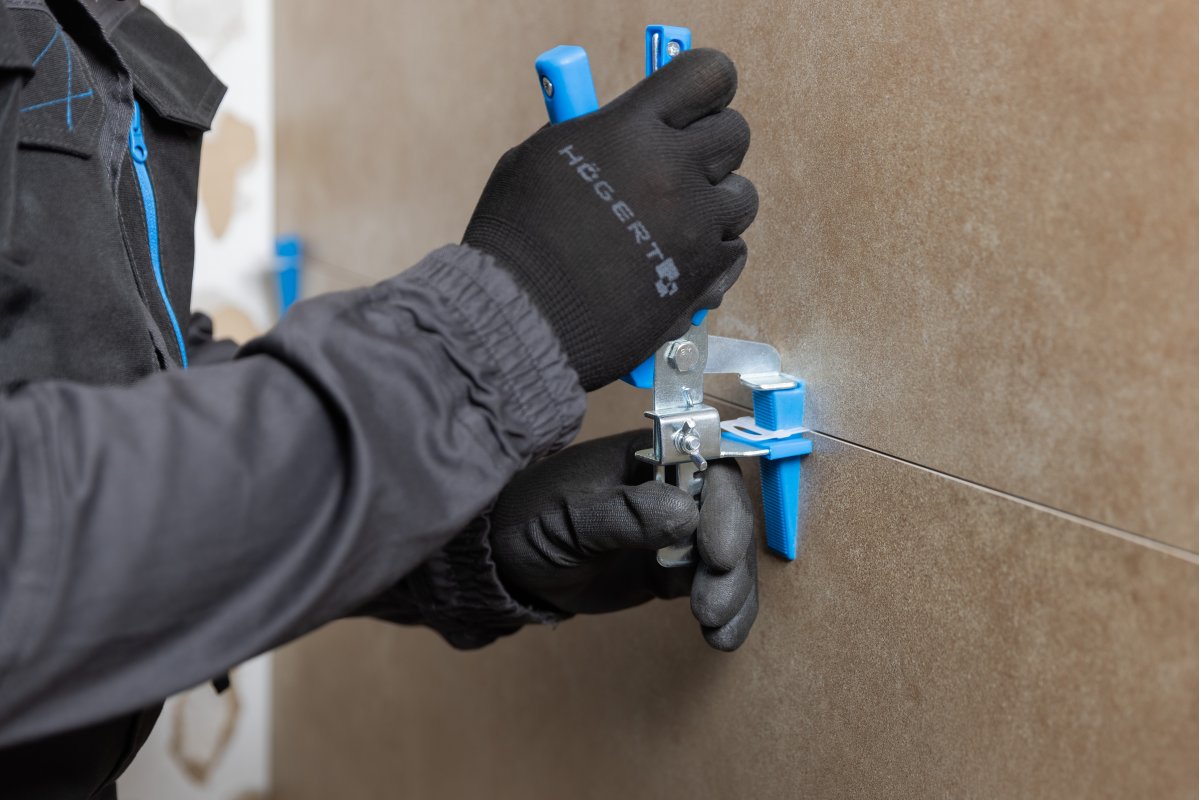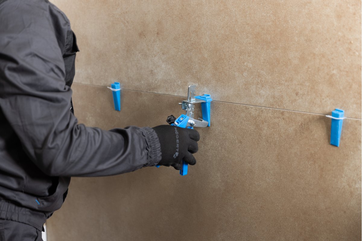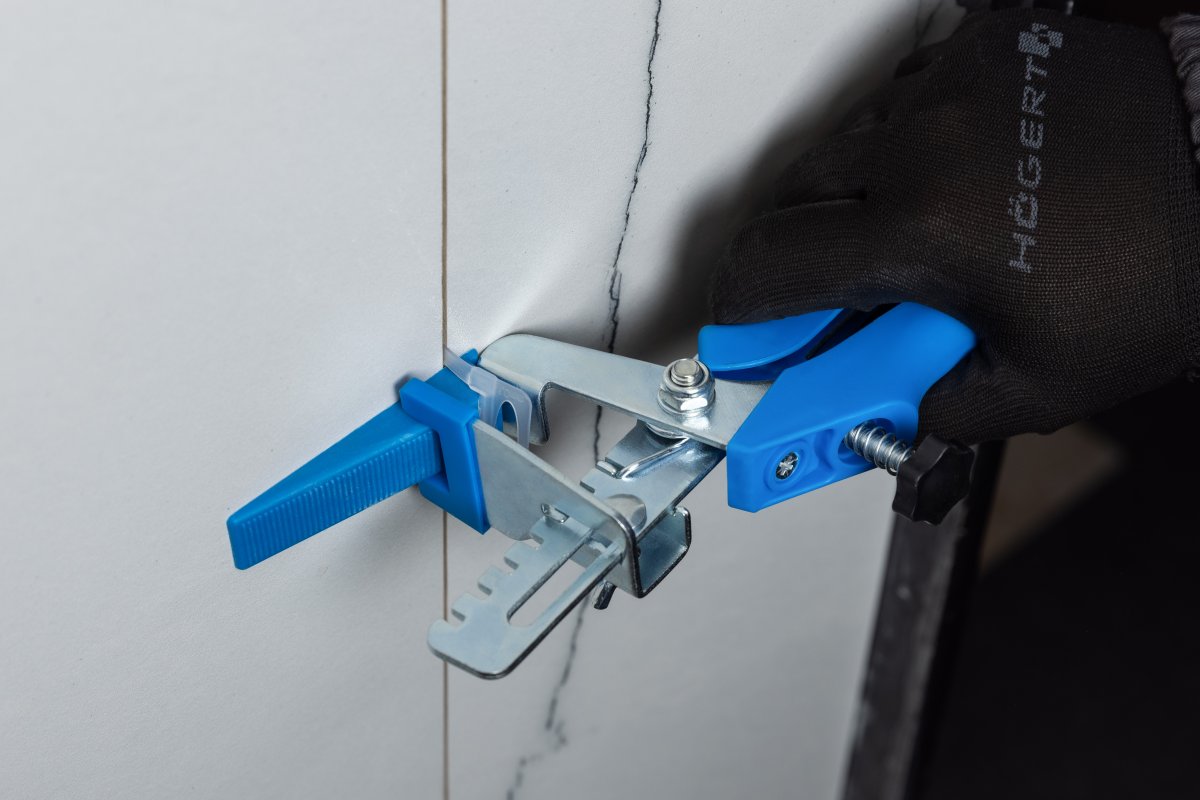 Система для быстрого и точного выравнивания плитки с определенным размером затирки, основанная на зажимах и клиньях.