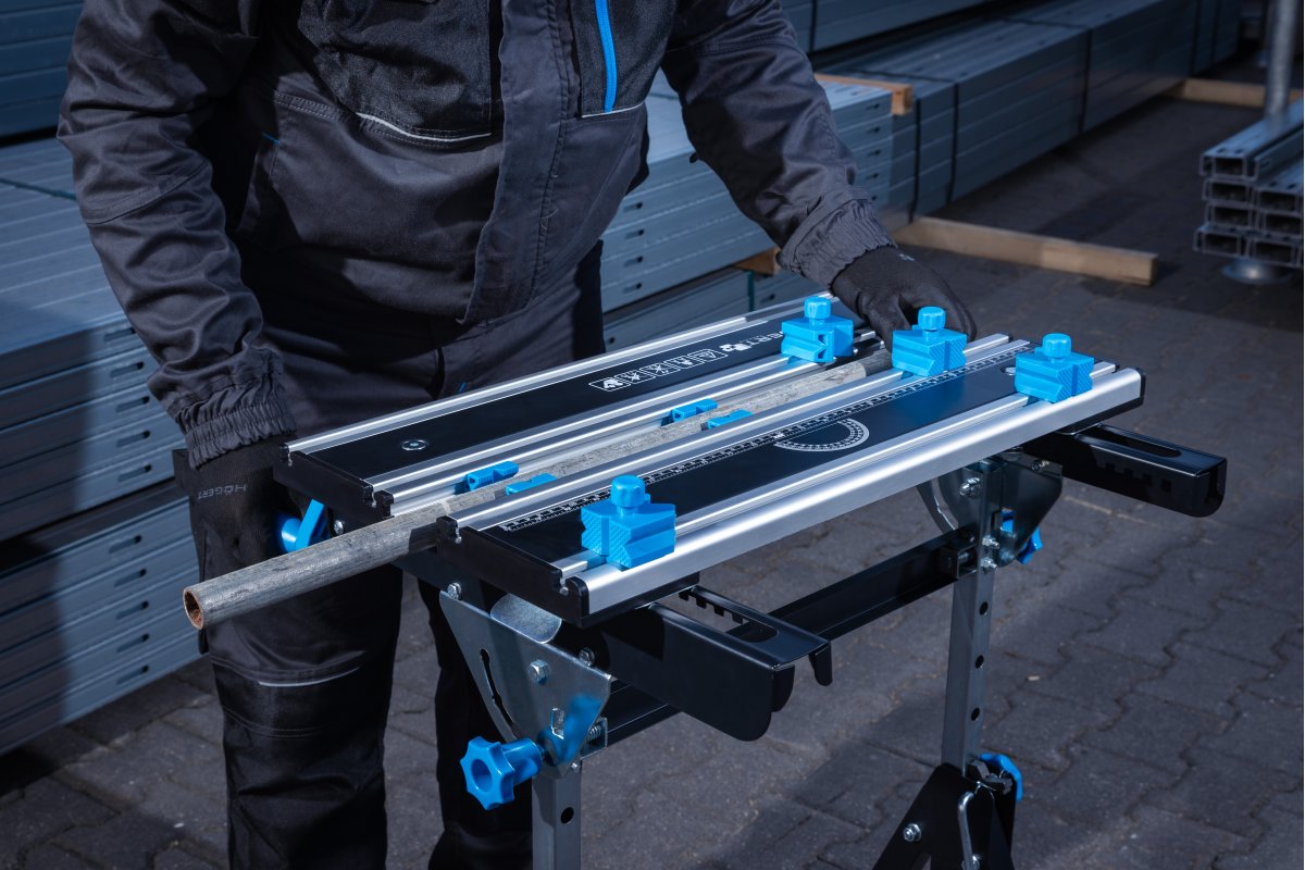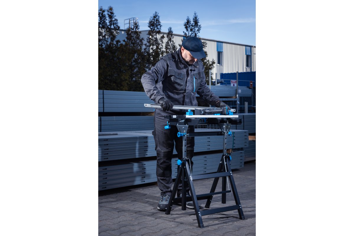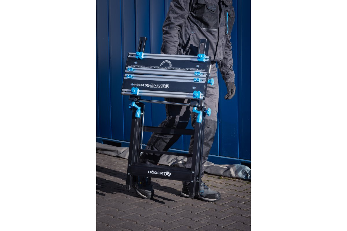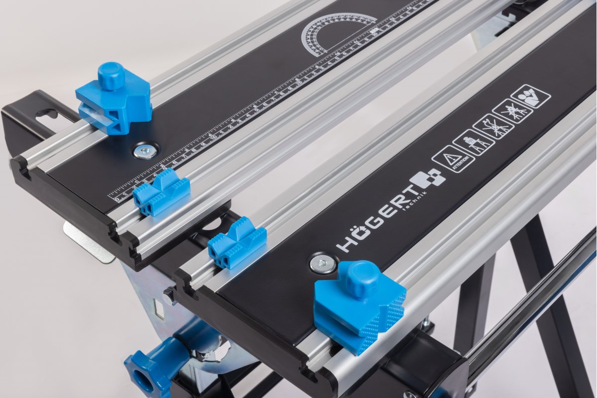 Прочная сталь и устойчивый и легкий алюминий, из которых изготовлены столешница и конструкция, гарантируют устойчивость и долговечность инструмента.