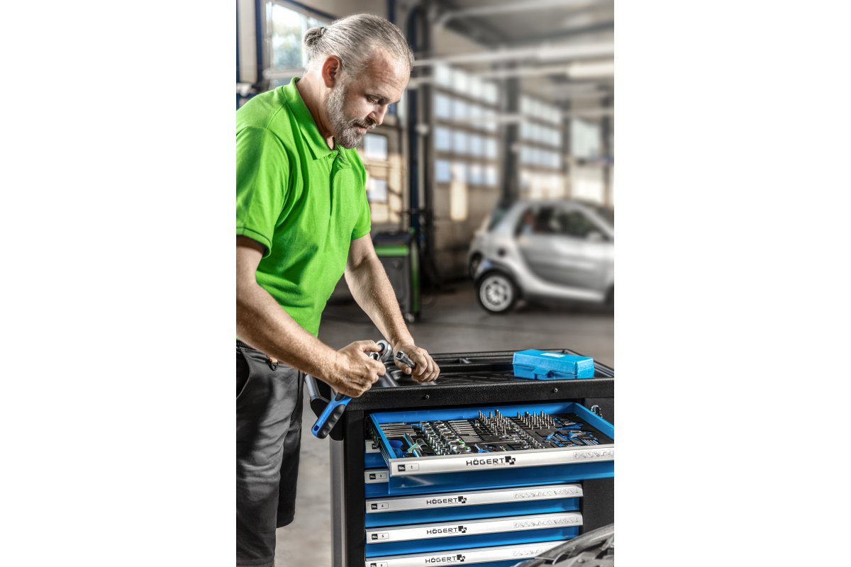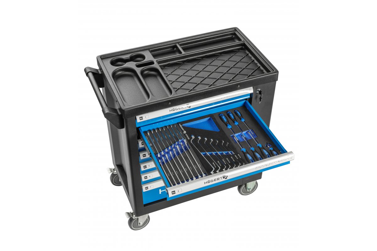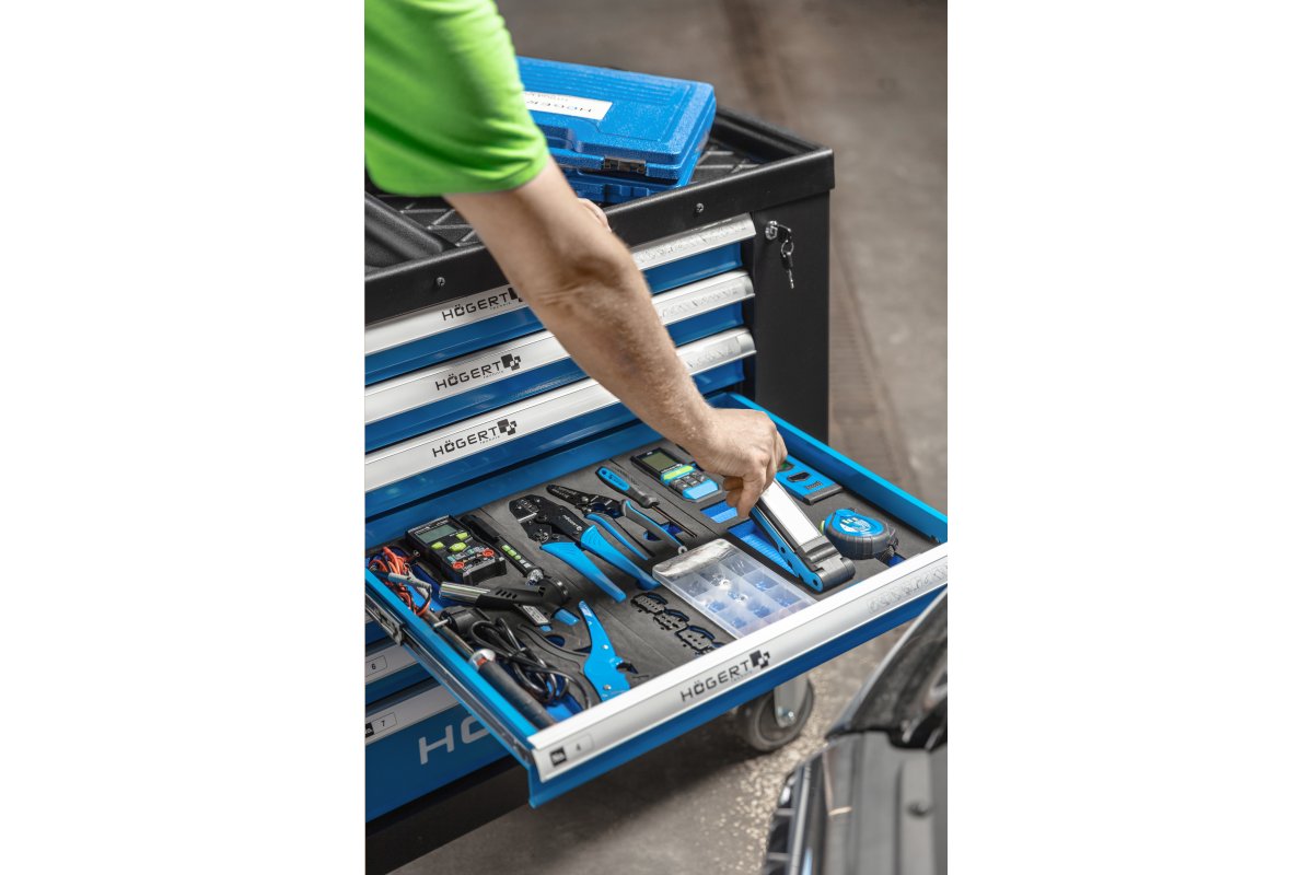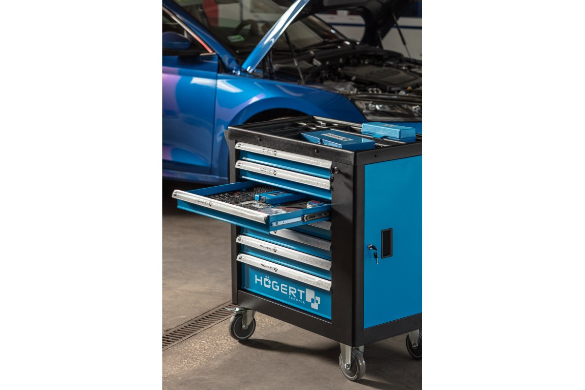 Практичный и вместительный шкаф для инструментов с 7 выдвижными ящиками и боковым отсеком. Прочная конструкция гарантирует длительное использование в условиях мастерской, а 4 колеса, в том числе 2 поворотных, обеспечивают мобильность, благодаря чему шкаф всегда будет на нужном месте. Благодаря соответствующим образом подобранному оснащению шкафа, состоящему из целых 544 элементов, предназначенному для ремесленных мастерских и автосервисов, он идеально подходит для работы любого профессионала.