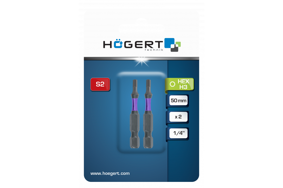 HOEGERT Биты ударные HEX 3, 50 мм, сталь S2, 2 шт.