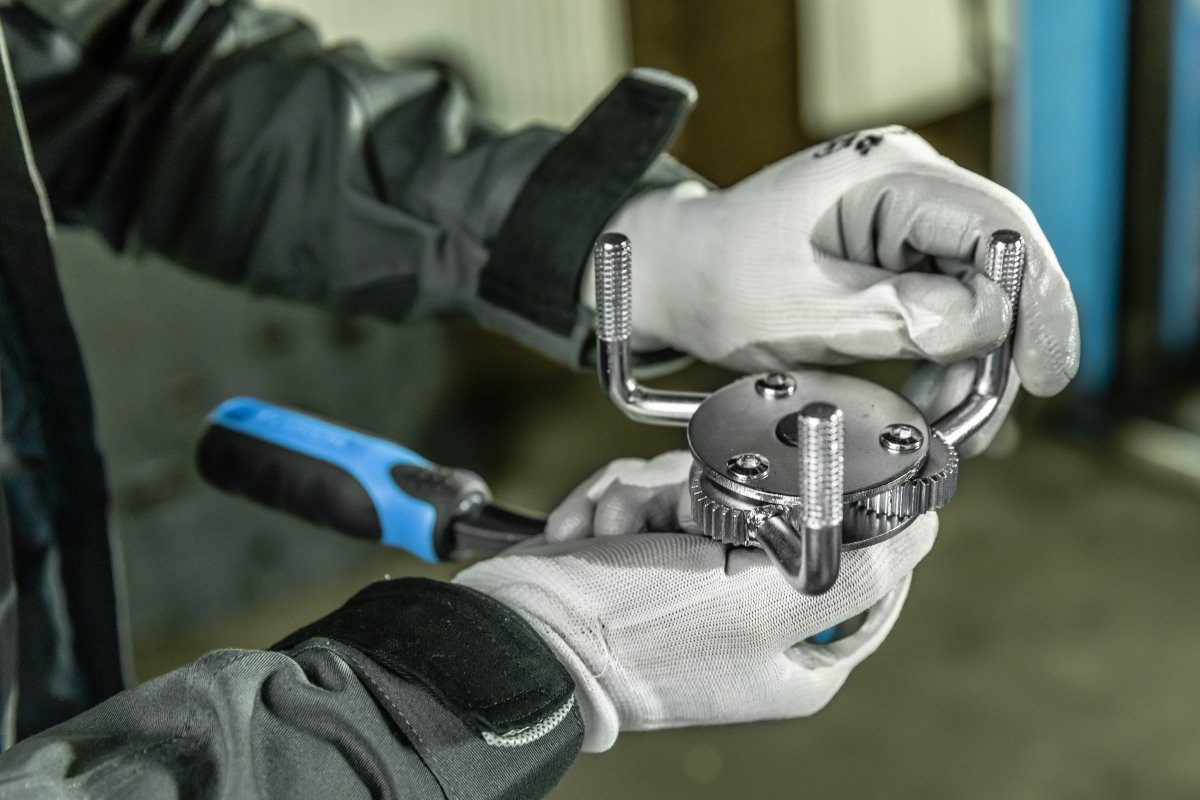 Универсальный ключ для откручивания масляных фильтров, автоматический подбор диаметра в диапазоне действия ключа.