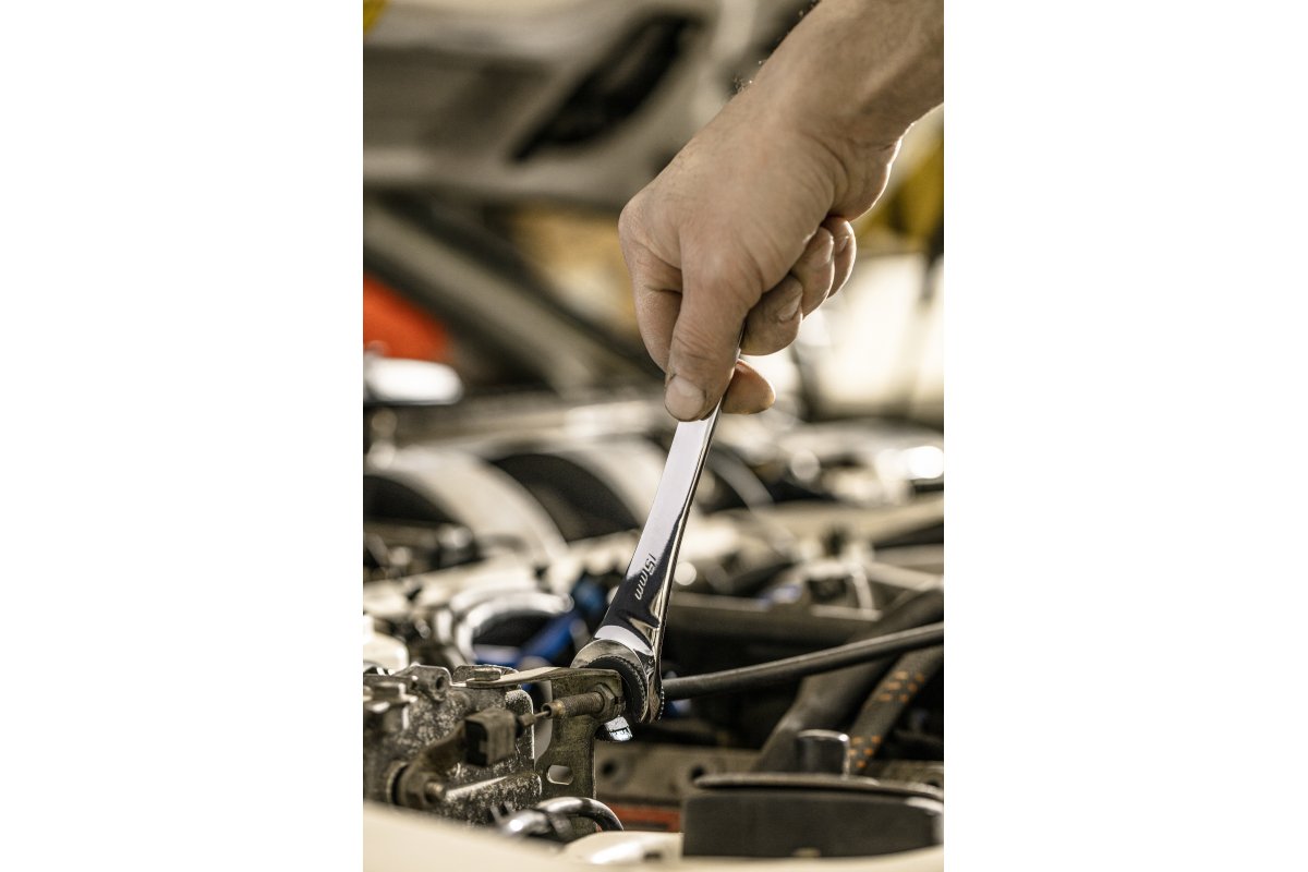 - Полуоткрытая конструкция трещеточного механизма позволяет накладывать ключ на болты независимо от их длины и наклона;