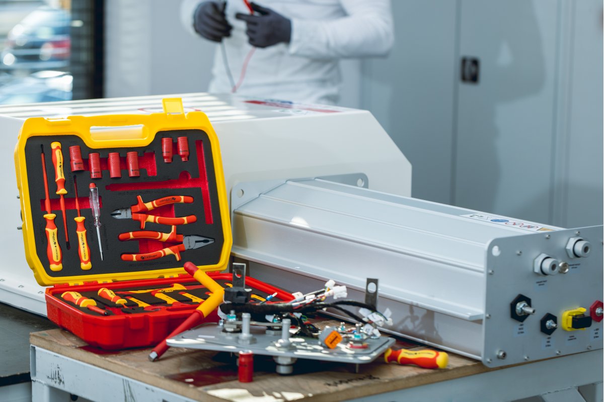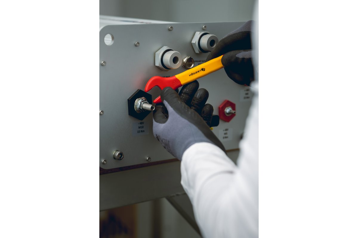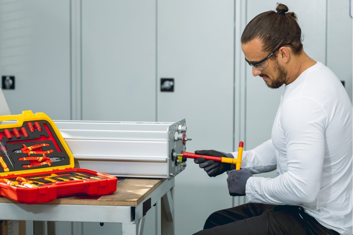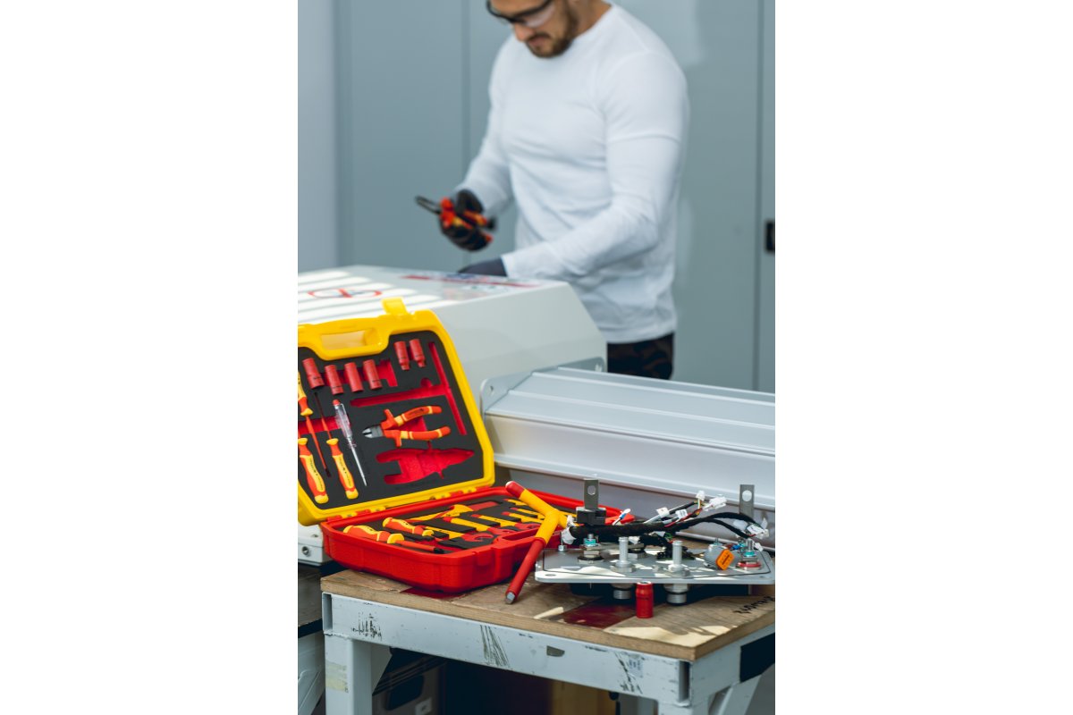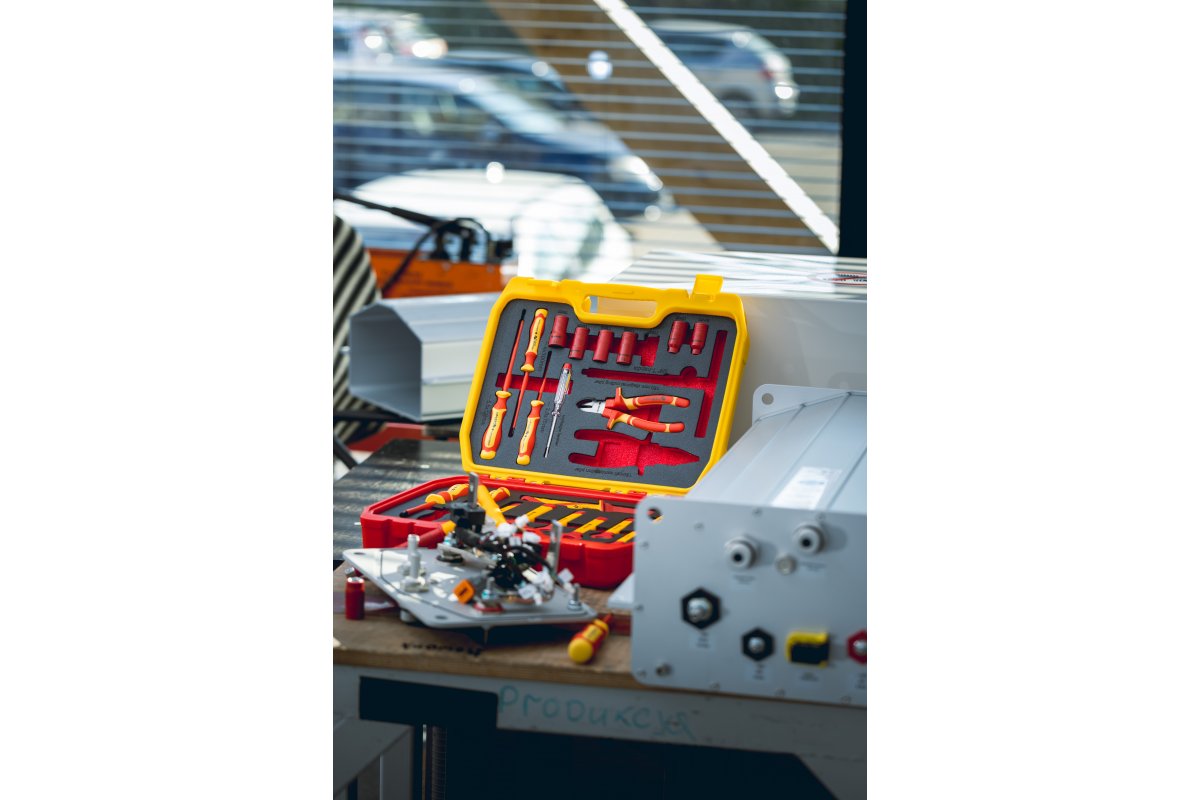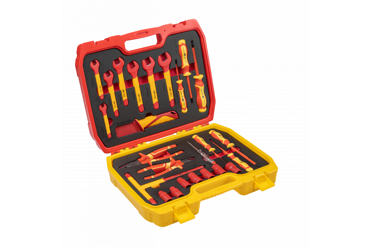 Набор изолированных инструментов из 25 предметов с сертификатом VDE для работы под напряжением до 1000 В. В него входят, в частности, отвертки, плоскогубцы, торцевые головки и гаечные ключи. Инструменты предназначены для электриков, а также механиков и монтажников.