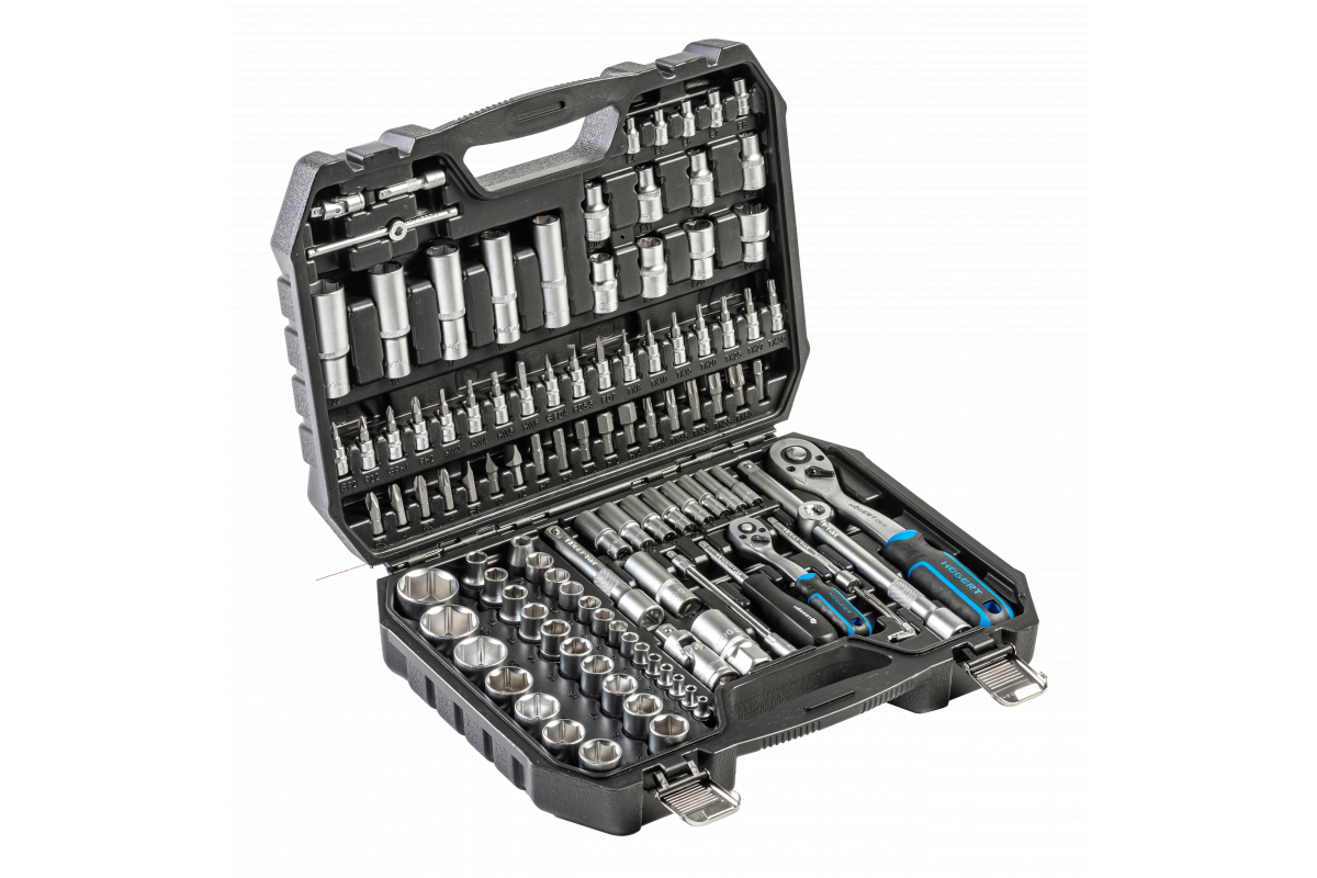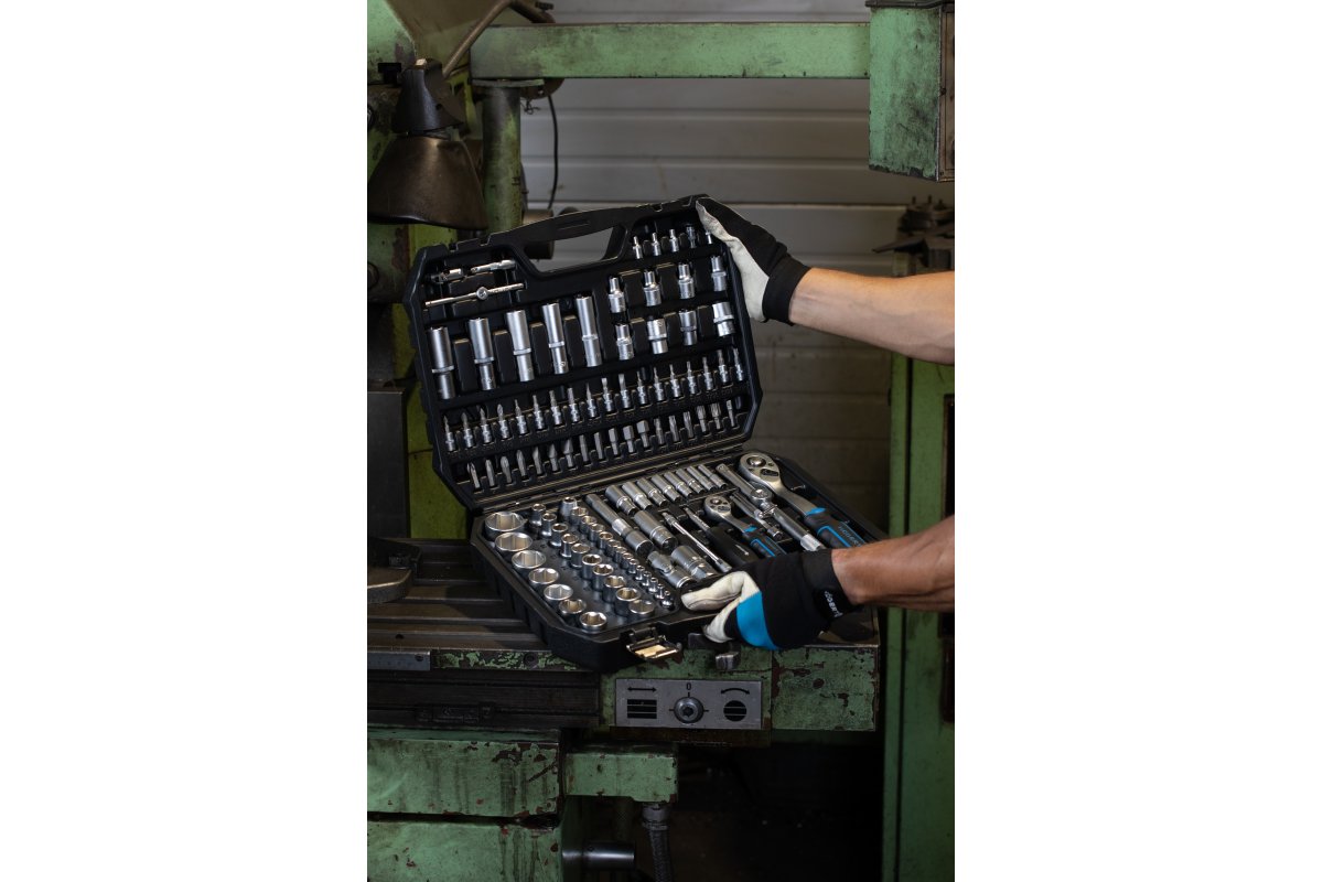 Головки и биты изготовлены из высококачественной легированной стали CrV . устойчивые к деформации . штампованная ковка . храповой механизм трещотки (72 зуба) изготовлен из высококачественной легированной стали CrMo, предназначенной для работы при высоких нагрузках . практичный кейс с металлическими петлями и замками