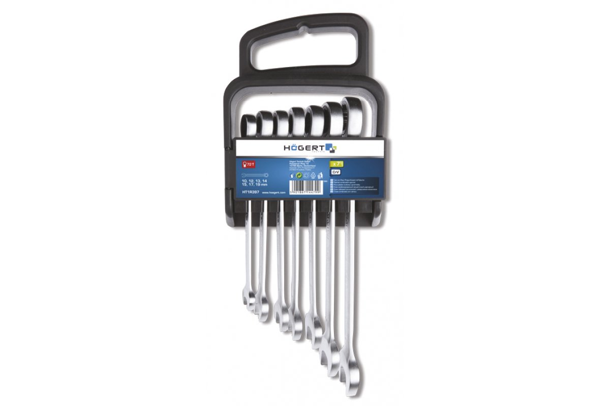 HOEGERT Набор комбинированных трещоточных ключей, 10-19 мм, 7 шт., 72T, сталь CrV 6140