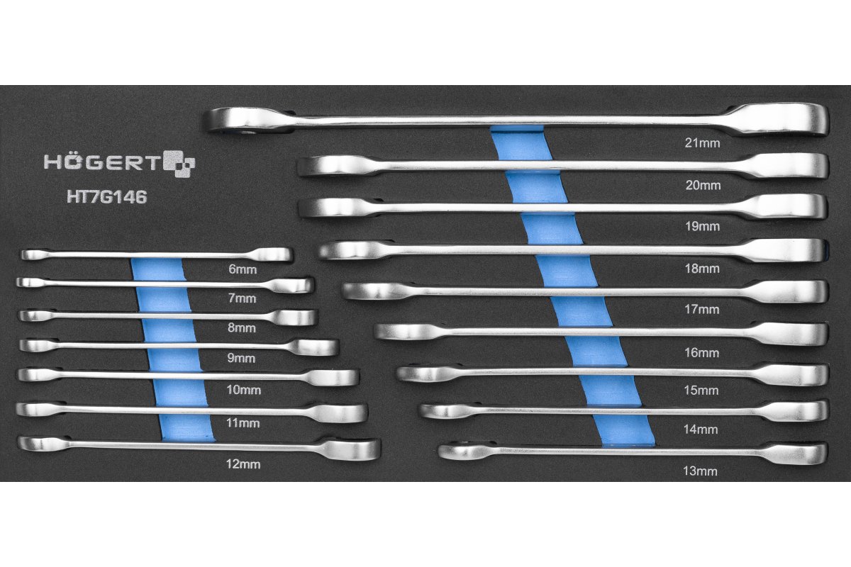 Ложемент для инструментов, содержащий комбинированные ключи с храповым механизмом для откручивания и навинчивания резьбовых соединений, заканчивающихся шестигранным, двенадцатигранным креплением или шестигранным креплением TORX. Благодаря храповику, нет необходимости менять ключ.