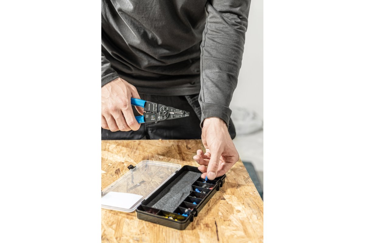 Обжимные клещи для электрических клемм с набором из 86 разъемов, упакованных в практичную пластиковую упаковку. Применяются в электронике, электрике, телекоммуникациях и других монтажных работах.
