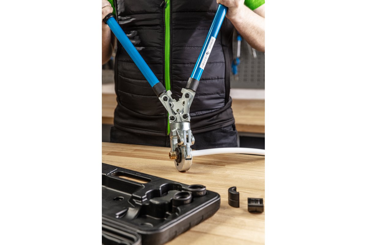 Ручной обжимной инструмент типа TH, предназначенный для обжима фитингов на трубах PEX-AL-PEX и PERT-AL-PERT. Позволяет точно и плотно обжать фитинги. Телескопические рукоятки позволяют удлинять их с 58 до 76 см, увеличивая таким образом усилие, необходимое для обжима соединителя. Система быстрой смены матриц.