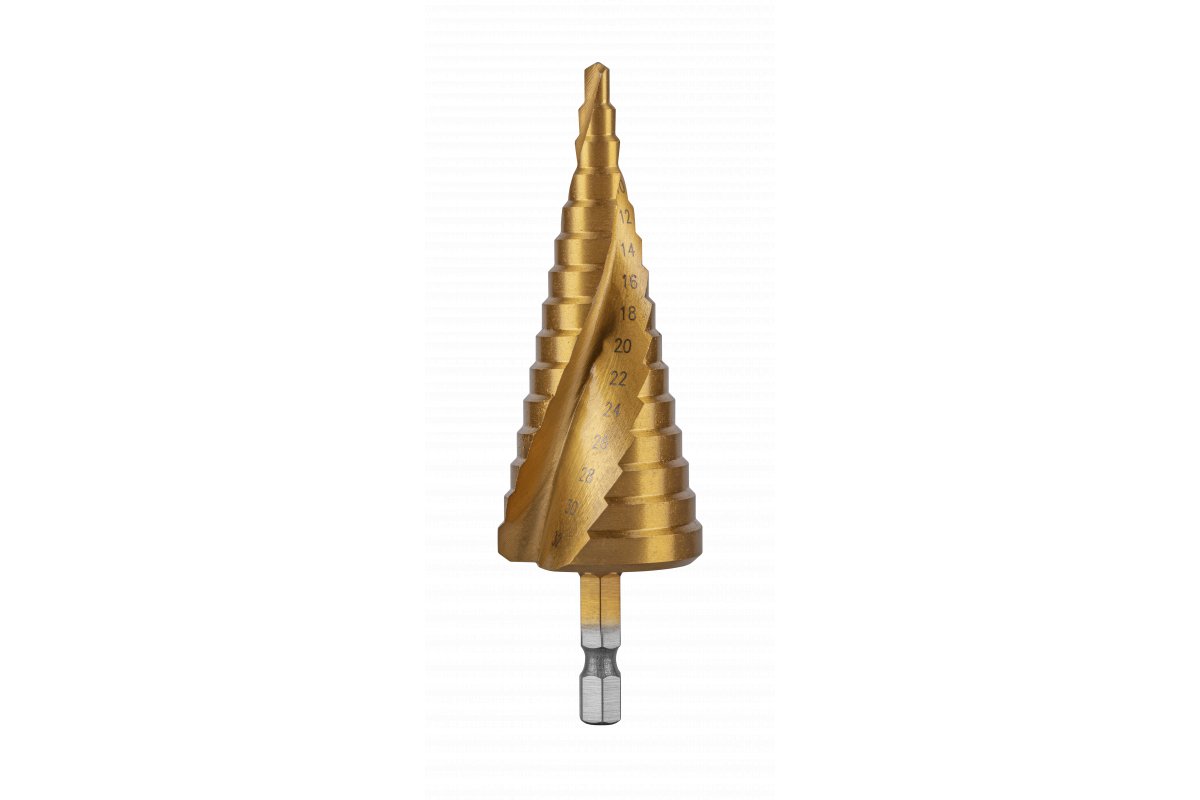 Ступенчатое спиральное сверло, предназначенное для сверления различных типов стали, цветных металлов, пластмасс и дерева. Позволяет сверлить точные отверстия. Сверло имеет спиральные режущие канавки, которые являются одной из наиболее эффективных технологий, используемых в ступенчатых сверлах, и позволяют гораздо быстро и эффективно сверлить отверстия, края которых остаются точно выровненными. Оно будет использоваться в мастерских по обработке листового металла, автомастерских или в работе установщиков и электриков. Для профессионального использования.
