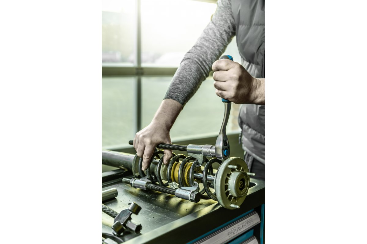 Стяжка пружин незаменима при профессиональном обслуживании шасси. Подходит для всех типов рессор в стойках типа макферсон (MacPherson) и независимых рессор. Стяжка работает с храповым механизмом 1/2″. Она имеет тонкую резьбу, что облегчает работу под нагрузкой пружины. Работа с устройством полностью безопасна благодаря специально профилированным двуплечим рукояткам.