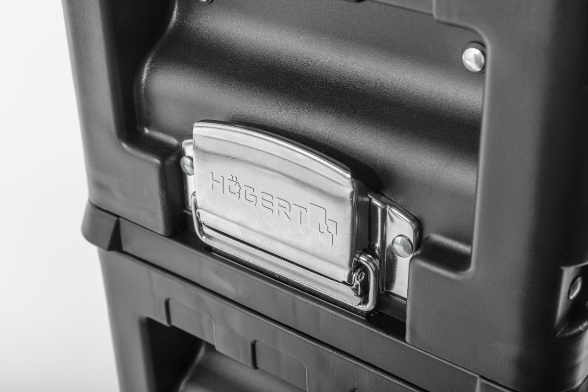 нижний сегмент с большим откидным ящиком размером 410 x 210 x 280 мм и грузоподъемностью 15 кг, с колесами, телескопической ручкой и дополнительной ручкой для переноски.