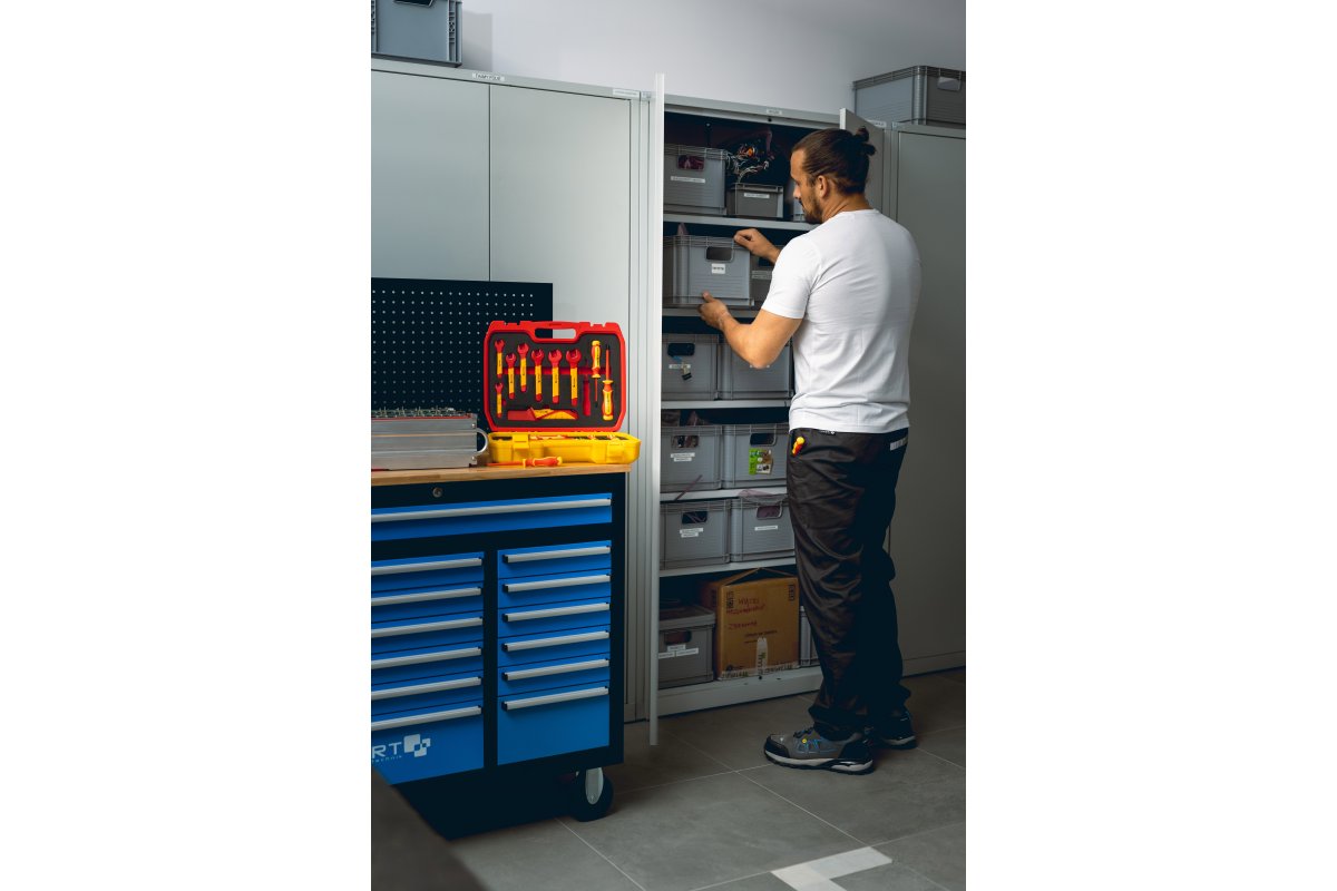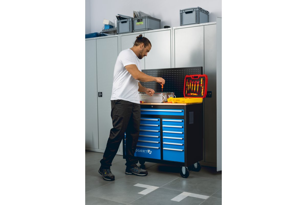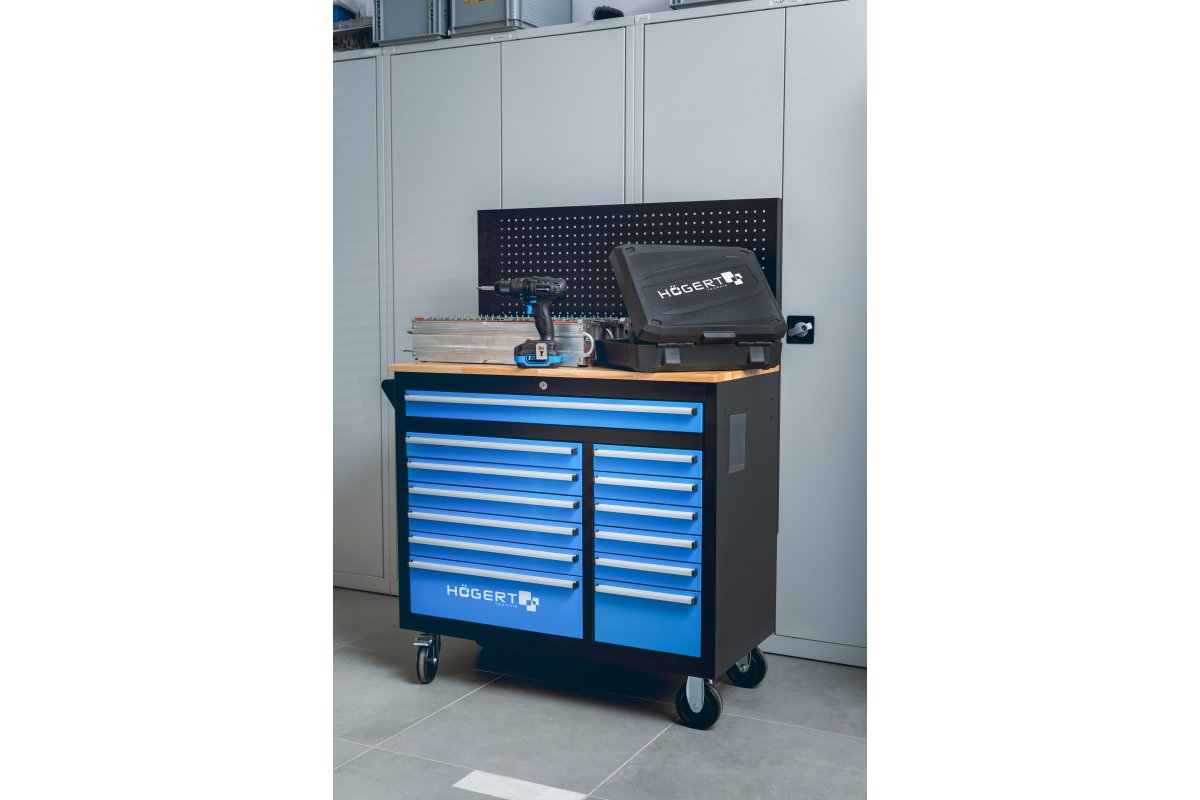 Очень просторная тележка инструментальная с 13 ящиками и настенной панелью для хранения инструментов и аксессуаров. С одним мебелью для мастерской вы можете обустроить целый универсальный рабочий стол.