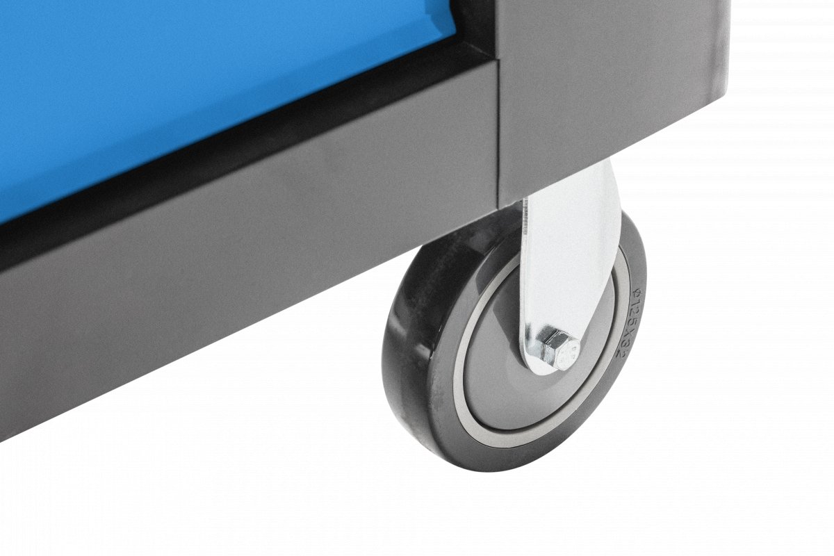 Практичная и просторная тележка с 7 ящиками и боковым отсеком. Прочная конструкция гарантирует длительное использование в условиях мастерской, а 4 колеса, включая 2 поворотных, обеспечивают мобильность, так что тележка всегда будет находиться в нужном месте. Она идеально подойдет как для авторемонтных мастерских.