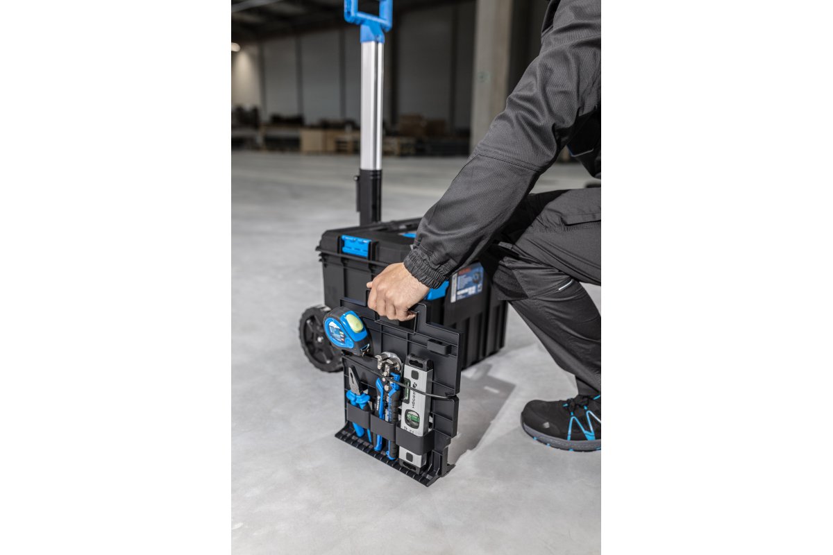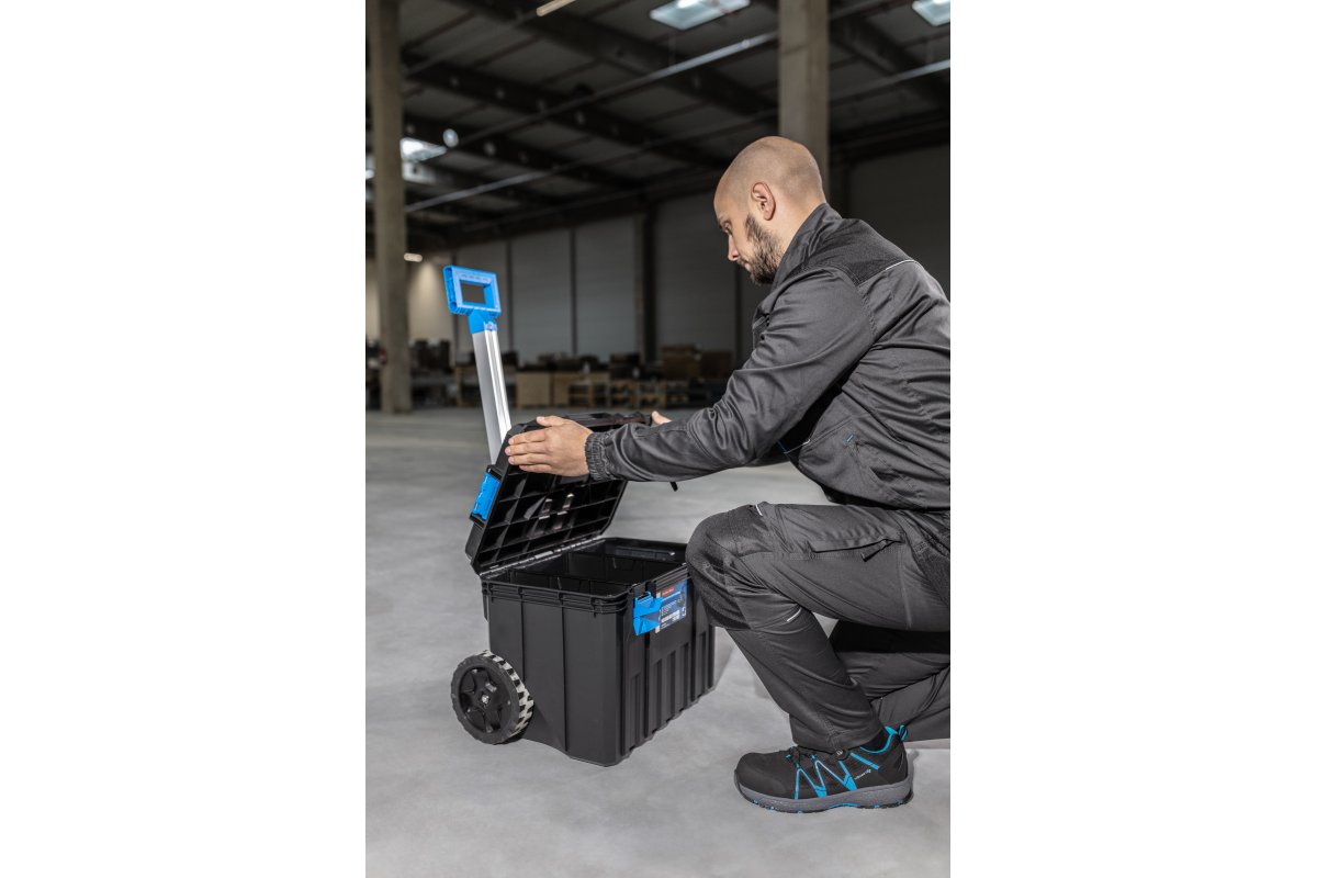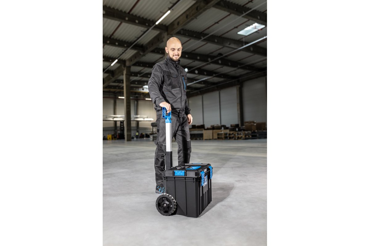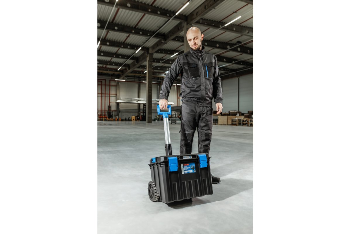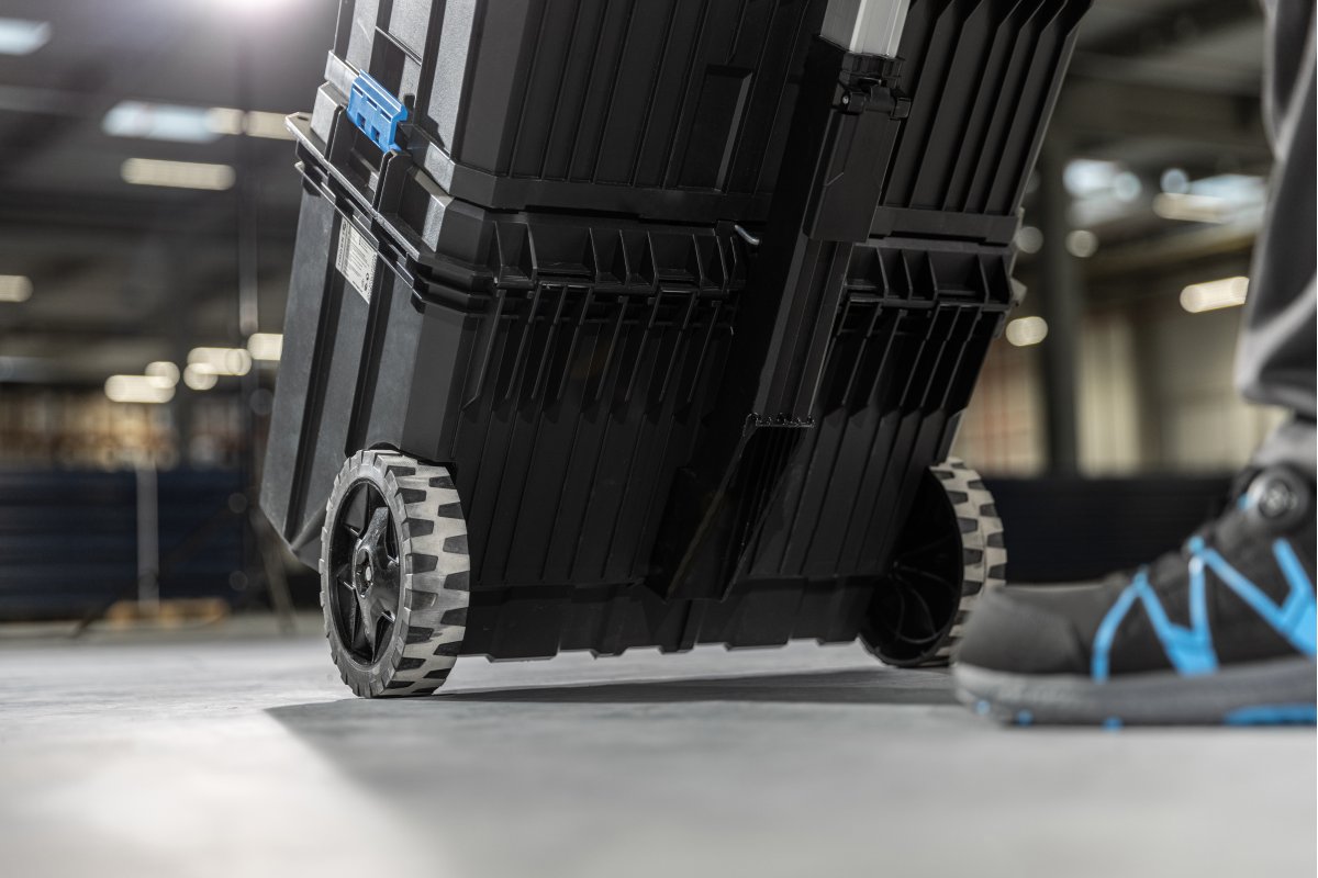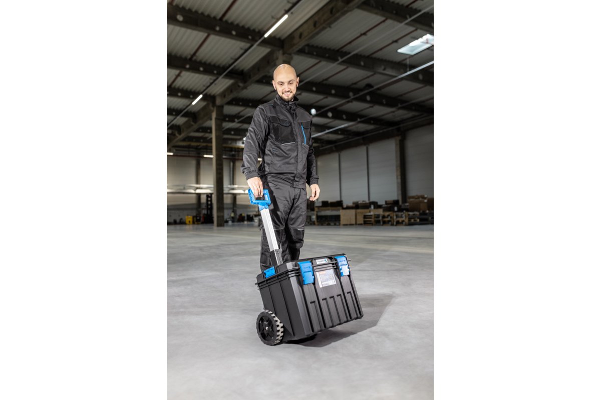 Ящик для инструментов на колесах-это прочное и удобное решение для любого требовательного пользователя. Он оснащен большими резиновыми колесами и эргономичной телескопической ручкой, что значительно влияет на комфорт использования продукта. Выдерживает нагрузку до 50 кг. Ящик для инструментов на колесах также может быть соединен с другими элементами системы SmartStore. Предназначен для профессионального использования. Он отлично используется во многих отраслях, таких как строительство, промышленность, автомобилестроение или логистика.