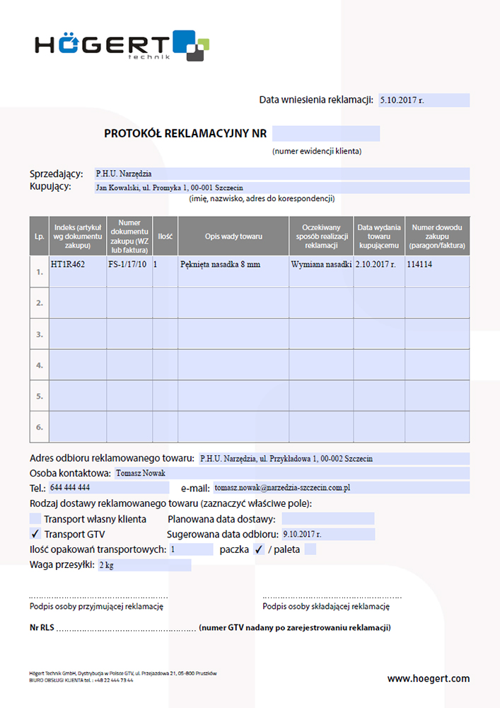 - Дистрибьютор инструментов Högert Technik заполняет форму рекламации (скачать). К заявке прилагается копия документа, подтверждающего покупку товара. Жалобы, поданные в другой форме, не рассматриваются.